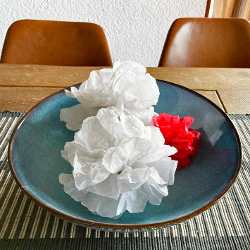 Dann ziehen Sie die einzelnen Lagen Seidenpapier vorsichtig auseinander. Fertig ist der Blütenball. Die Pompons können als Deko für den Tisch, am Fenster oder an Ästen aufgehangen werden oder auch ein Blütenmeer in einer Schale bilden.