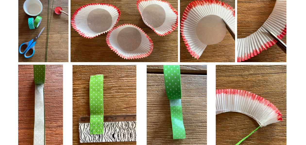 Wickeln Sie das Washi Tape um den Blumendraht. Dann legen die die 3 gerillten Teile der Muffinförmchen übereinander und wickeln diese um den Draht. Drücken Sie den unteren Teil anschließend etwas platt und kleben es mit Washi Tape fest. Ziehen Sie die „Blüten“ auseinander. Für die Blätter können Sie zwei Washi-Tape Streifen aufeinander kleben, wobei ein Streifen länger ist als der andere. Sie können ein Lineal als Hilfsmittel nutzen und das längere Band hier befestigen. Alternativ können Sie das Washi-Tape auch einfach länger ausrollen und dann übereinanderlegen. Schneiden Sie dann die Blattform aus und wickeln das längere Stück um den Draht. Zuletzt biegen Sie die Blätter noch nach Wunsch zurecht.