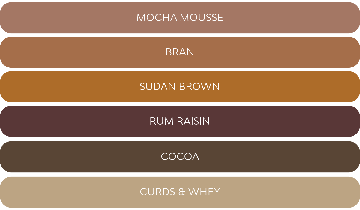 Braun fördert unser Wohlbefinden. Inspiriert von den Fashion Weeks in London und New York, wurden für Frühjahr und Sommer 2025 weitere auffällige und zeitlose Brauntöne in die Palette der Trendfarben aufgenommen: Sudan Brown mit einem leichten Goldschimmer ist ein auffälliger, starker Braunton, in dem ein Hauch von Abenteuer mitschwingt. Bran, ein dunkleres und erdiges Braun, wirkt ebenso wie die hellere, fast beige Braunnuance Curds & Whey wie eine sichere Kraftquelle und Basis für unsere individuelle Entfaltung. Cocoa und Rum Raisin hingegen erinnern an Schokolade und hüllen uns ein in das Gefühl, geborgen zu sein.